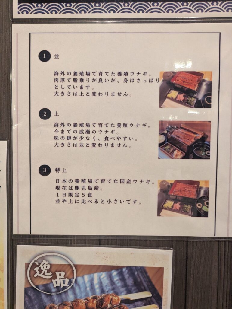 席に着いてメニューを開くと、鰻のランクが3つに分かれています。ここ、注文時に迷うポイントですよね。メニュー表をもとに解説します。