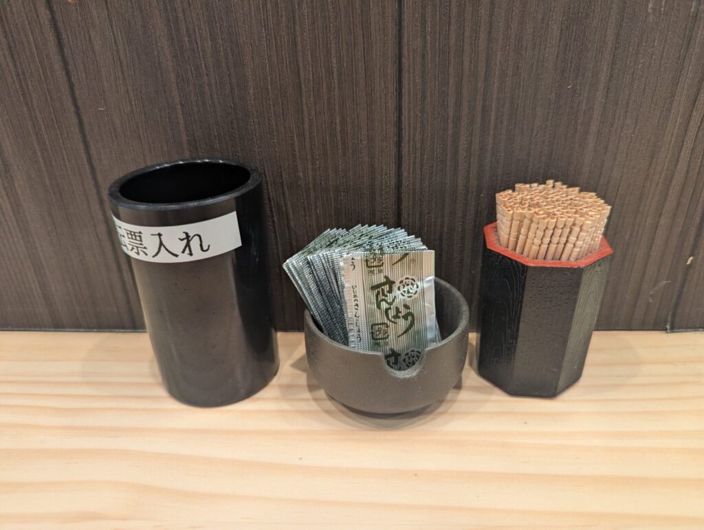 ▲卓上には「山椒」の小袋と爪楊枝、伝票入れのみとシンプル。