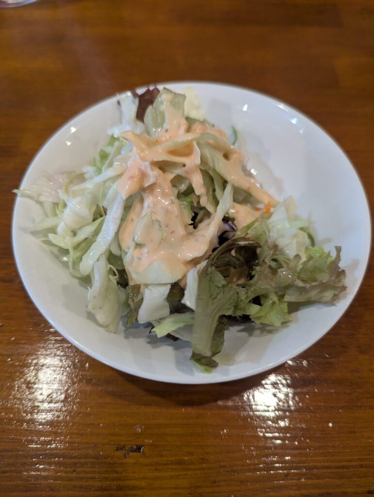 キャベツとレタスのサラダには、インド料理店でおなじみのオレンジ色のドレッシング(サウザンアイランド風)がたっぷり。 野菜のシャキシャキとした食感と、ドレッシングのまろやかな酸味が、空腹の胃袋を優しく刺激します。
