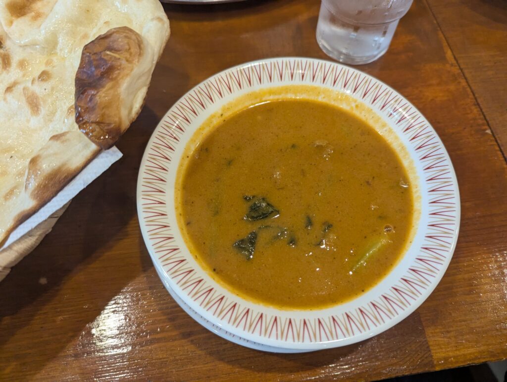 スプーンでひと口すすると……「あ、美味しい!」 小辛(2番)を選びましたが、ピリッとした刺激が舌に心地よく、後からカルダモンやクミンと思われる爽やかな香りが鼻に抜けていきます。 煮込まれたチキンはスプーンでほぐれるほど柔らかく、小松菜のシャキッとした食感が良いアクセントになっていました。
