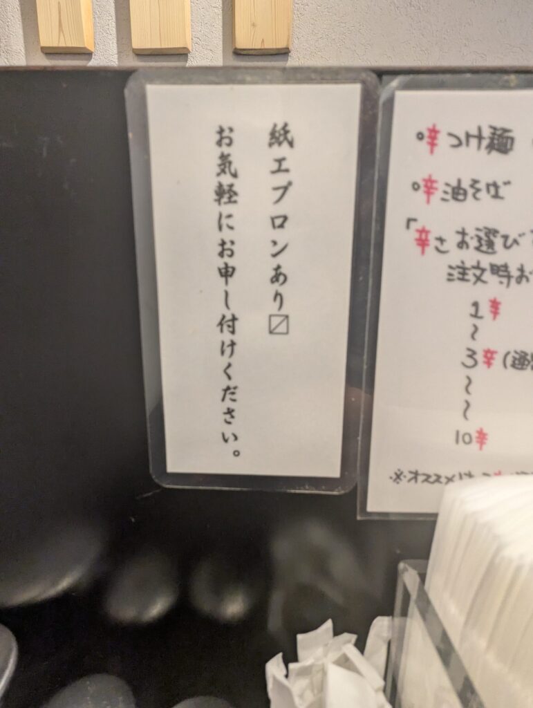 席に着いて嬉しかったのが、「紙エプロンあり」の案内。 つけ麺やラーメンは汁跳ねが気になるので、白いシャツを着ている時でも安心して食べられますね。