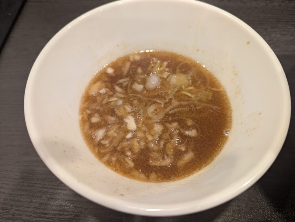 スープは、動物系のコクと魚介の旨味がバランスよく合わさった濃厚な味わい。 中には刻み玉ねぎが入っており、シャキシャキとした食感と甘みが良いアクセントになっています。濃厚なのに後味は意外とすっきりしていて、重たさを感じません。